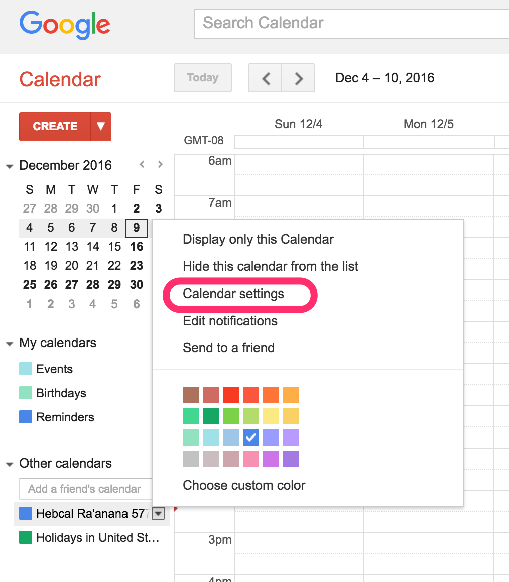 9. If you need to make changes, you can click on the Hebcal calendar in the left and select “Calendar settings” from the pop-up menu.