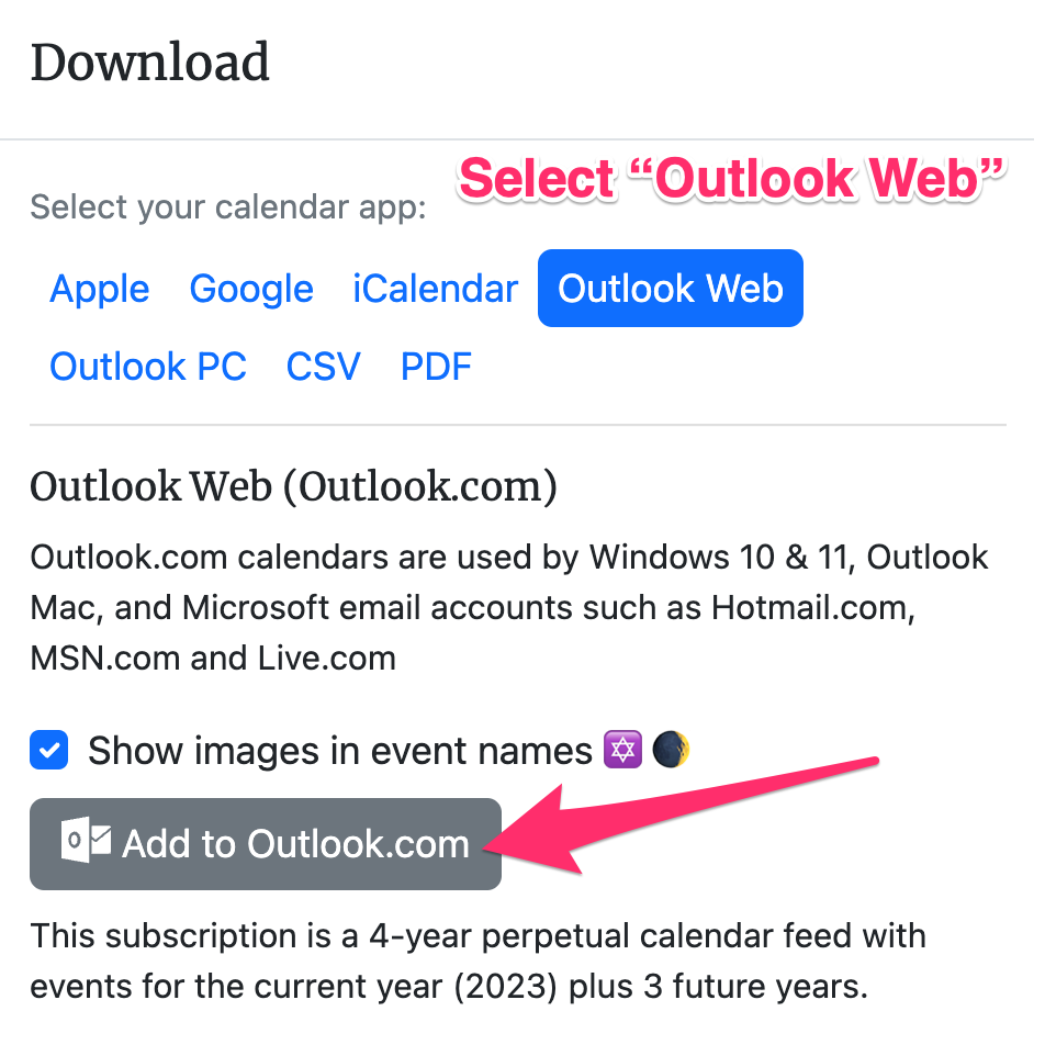 We occasionally receive reports from Outlook on Windows users experiencing a problem with Hebcal calendar events spanning two days. For example, rather than a holiday appearing as an “all-day” event with no particular time, each event appears to be a 24-hour long event that starts at 11pm (23:00) on one day, and end at 11pm on the other day.