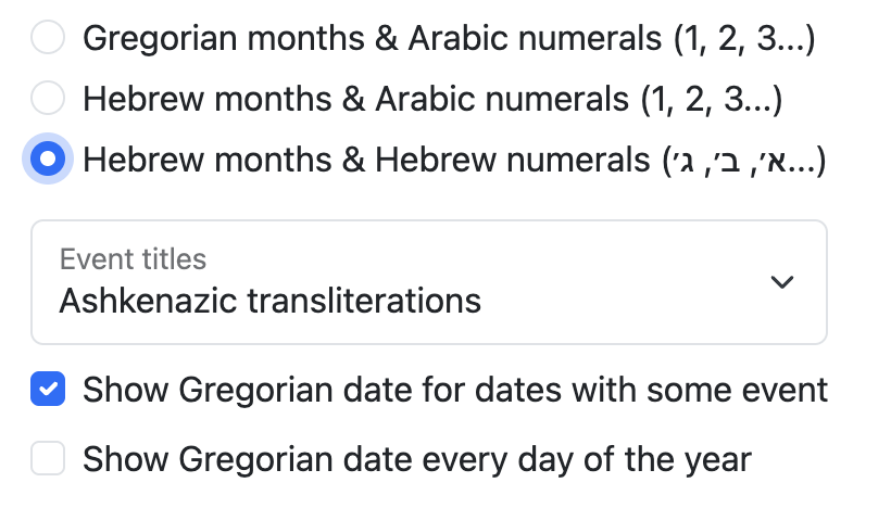 In December 2025, Hebcal added support for fully Hebrew calendars, introducing a fundamentally different calendar model from the traditional Gregorian-first layout. Instead of presenting Gregorian months with Hebrew dates as annotations, this new mode uses Hebrew months as the primary structure, with Gregorian dates shown as secondary, auxiliary information.