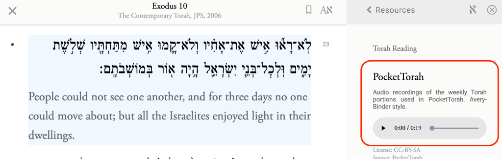 If you visit the Hebcal parsha pages from a larger display (desktop/laptop computer or a tablet), you can click the speaker icon to visit Sefaria‘s embedded PocketTorah audio.