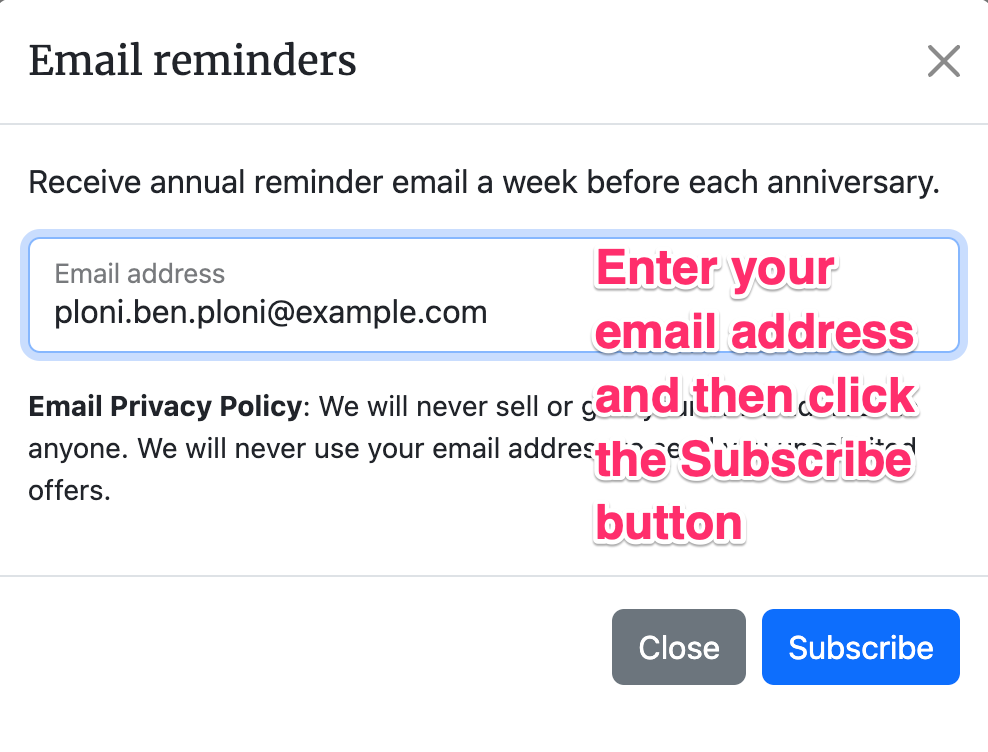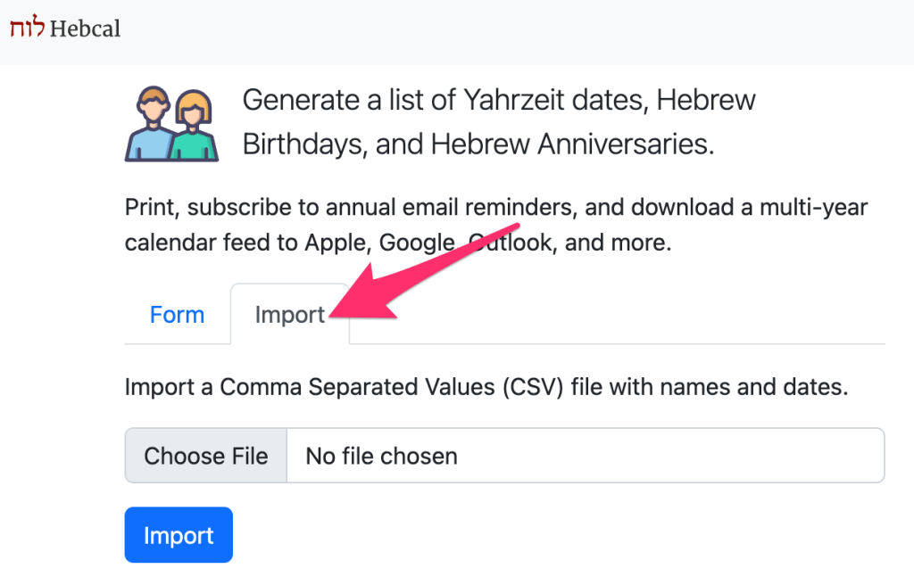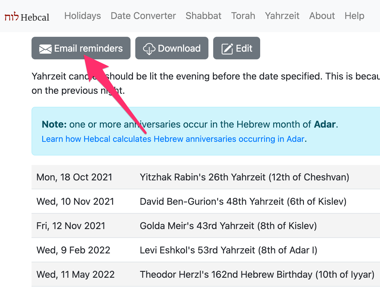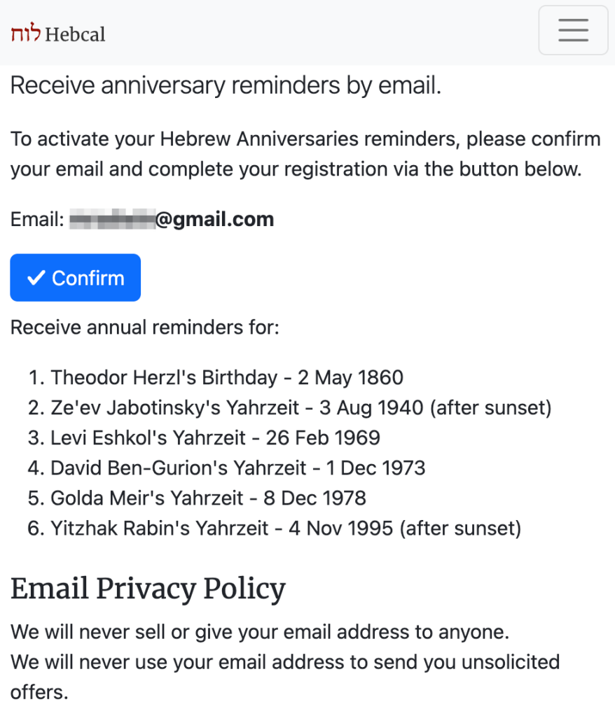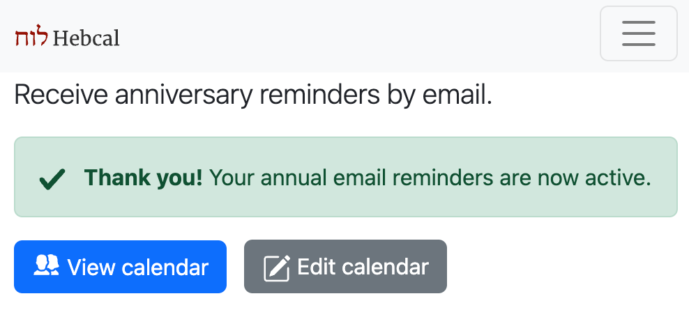 To keep things simple, Hebcal does not require any user registration or login. After creating your calendar, you may optionally sign up to receive annual reminder emails (sent one week before and one day before each anniversary).